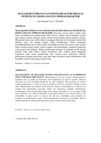 MANAJEMEN PERAWATAN SISTEM REAKTOR SEBAGAI PENDUKUNG KESELAMATAN OPERASI REAKTOR. Perawatan sistem reaktor adalah usaha untuk memelihara dan memperbaiki SSK (Sistem, struktur dan Komponen) reaktor agar bekerja normal sehingga operasi reaktor tetap berjalan dalam keadaan selamat. Manajemen perawatan sistem reaktor menangani beberapa sub kelompok sistem (Sub Bidang) yang satu dengan lainnya saling berhubungan. Untuk melakukan pemeliharaan/perawatan sistem reaktor disusunlah prosedur perawatan sistem reaktor untuk masing-masing sistem, jadwal inspeksi dan penanganan, organisasi pelaksana serta pengawasan kegiatan. Dalam pelaksanaan kegiatan di lapangan masih banyak kendala yang perlu diatasi seperti penyediaan suku cadang untuk mengganti komponen yang rusak, penjadwalan, dan evaluasi hasil perawatan. Dengan pelaksanaan program perawatan yang baik maka kerusakan dapat diminimalisir dan keandalan operasi tetap terjaga dengan baik.