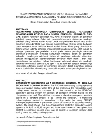 PEMANTAUAN KANDUNGAN ORTOFOSFAT SEBAGAI PARAMETER PENGENDALIAN KOROSI PADA SISTEM PENDINGIN SEKUNDER RSG-GAS. Sistem Pendingin sekunder RSG-GAS merupakan sistem air pendingin sirkulasi ulang terbuka. Salah satu permasalahan pada sistem air pendingin sirkulasi ulang terbuka adalah korosi. Untuk mengendalikan korosi pada sistem pendingin sekunder RSG-GAS dengan menambahkan inhibitor korosi berbahan dasar senyawa fosfat. Inhibitor korosi adalah bahan kimia yang ditambahkan dalam jumlah tertentu sehingga menghambat terjadinya korosi. Oleh sebab itu sebagai parameter pengendalian korosi pada sistem pendingin sekunder dilakukan pemantauan terhadap kandungan ortofosfat dalam air pendingin sekunder. Kandungan ortofosfat dalam air pendingin sekunder ditentukan dengan menggunakan spektrofotometer DR/2400 merk Hach . Dari hasil pemantauan menunjukan bahwa kandungan ortofosfat dalam air pendingin sekunder berfluktuasi berkisar 9,45 ppm – 16,36 ppm dan dengan diketahuinya kandungan ortofosfat dalam air pendingin sekunder dapat digunakan sebagai kontrol dosis inhibitor korosi yang ditambahkan pada sistem pendingin sekunder