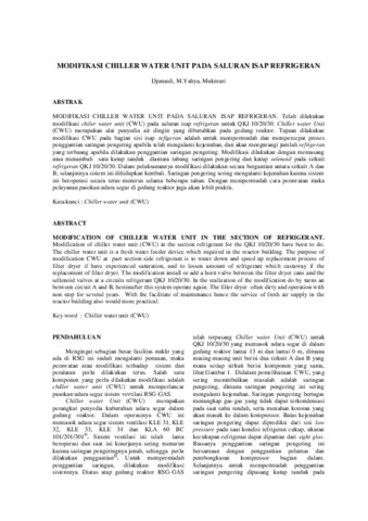 MODIFIKASI CHILLER WATER UNIT PADA SALURAN ISAP REFRIGERAN. Telah dilakukan modifikasi chiler water unit (CWU) pada saluran isap refrigeran untuk QKJ 10/20/30. Chiller water Unit (CWU) merupakan alat penyedia air dingin yang dibutuhkan pada gedung reaktor. Tujuan dilakukan modifikasi CWU pada bagian sisi isap refigeran adalah untuk mempermudah dan mempercepat proses penggantian saringan pengering apabila telah mengalami kejenuhan, dan akan mengurangi jumlah refrigeran yang terbuang apabila dilakukan penggantian saringan pengering. Modifikasi dilakukan dengan memasang atau menambah satu katup tanduk diantara tabung saringan pengering dan katup selenoid pada sirkuit refrigeran QKJ 10/20/30. Dalam pelaksanannya modifikasi dilakukan secara bergantian antara sirkuit A dan B, selanjutnya sistem ini dihidupkan kembali. Saringan pengering sering mengalami kejenuhan karena sistem ini beroperasi secara terus-menerus selama beberapa tahun. Dengan mempermudah cara perawatan maka pelayanan pasokan udara segar di gedung reaktor juga akan lebih praktis.
