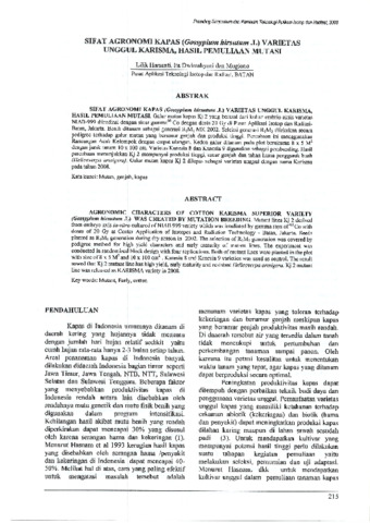Galur rnutan kapas Kj 2 yang berasal dari kultur embrio aksis varietas NIAB-999 diiradiasi dengan sinar gamma 60Co dengan dosis 20 Gy di Pusat Aplikasi Isotop dan Radiasi¬Batan, Jakarta. Benih ditanam sebagai generasi RIMI MK 2002. Seleksi generasi RIM2 dilakukan secara pedigree terhadap galur mutan yang berumur genjah dan produksi tinggi. Percobaan ini menggunakan Rancangan Acak Kelompok dengan empat ulangan. Kedua galur ditanarn pada plot berukuran 8 x 5 M2 dengan jarak tanam lOx 100 em, Varietas Kanesia 8 dan Kanesia 9 digunakan sebagai pembanding. Hasil percobaan menunjukkan Kj 2 mempunyai produksi tinggi, umur genjah dan tahan hama penggerek buah (Helicoverpa armigera). Galur mutan kapas Kj 2 dilepas sebagai varietas unggul dengan nama Karisma pada tahun 2008.