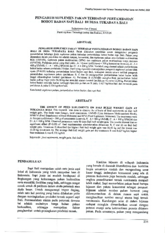 Telah dilakukan penelitian untuk mengetahui pengaruh penambahan beberapa jenis suplemen pakan terhadap pertambahan bobot bad an sapi Bali. Pakan yang digunakan dalam penelitian ini adalah rumput, konsentrat, dan suplemen pakan urea molases multinutrien blok (UMMB), suplemen pakan multinutrien (SPM) dan suplemen pakan multinutrien tanpa molases (SPMTM). Perlakuan pakan yang diuji yaitu ; A : hijauan (adlibihlm) + 500 g konsentrat (kontrol), B : A + 400 g UMMB, C : A + 400 g SPMTM dan D : A + 400 g SPM. Variabel yang diamati adalah pertambahan bobot badan selama perlakuan 3 bulan. Hasil yang diperoleh menunjukkan pengaruh suplemen pakan tidak nyata (P>0.05) terhadap pertambahan bobot badan sapi Bali, walaupun secara umum terlihat pengaruh penambahan supelemen pakan (perlakuan B, C dan D) menghasilkan pertambahan bobot badan lebih tinggi dibandingkan kontrol (perlakuan A). Perlakuan B (UMMB) rnenghasilkan pertambahan bobot badan paling tinggi yaitu 56,40 kg dan terendah adalah kontrol (perlakuan A) yaitu 12,20 kg. Pertambahan bobot badan rata-rata harian tertinggi diperoleh perlakuan B yaitu 0.627 kglekorlhari dan terendah pada perlakuan A yaitu 0.136 kg/ekor/hari.