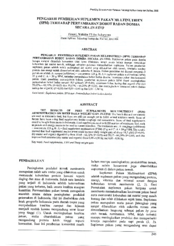 The basalt diet and concentrate are used as ruminants feed, but these are still not enough yet to fulfill animal nutrients needs. Some of farmer have been using feed supplements beside roughage and concentrate. Some of feed supplements could be bought from stores in Indonesia. Feed supplements need to fulfill nutrient of ruminants feed, such as protein and energy source to be used by rumen microbes. The treatments are; A: roughage (adl/bilum) + concentrate 125 g, B: A + feed supplement multinutrient (FSM) 25 g and C: A + 50 g FSM. The results showed that feed supplement multinutrient could increase daily weight gain of sheep 18,5 glh/d (P>0,05), dry matter and organic digestibility from 55,65 - 62,32% (P>0,05) and 59,17 - 66,29% (P<0,05), and also improve feed consume (dry matter and organic) from 0,89 - 0,95 kg and 0,81 - 0,86 kg.
