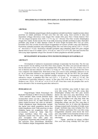 Telah dilakukan pengembangan teknik pengukuran radioaktif partikulat. Langkah pertama dalam penelitian ini adalah pembuatan 10 buah serat filter dari labu oyong. Serat tersebut di tekan dan dipanaskan sehingga dimensinya setara dengan filter standar (fibre glass filter). Ukuran diameter filter 110 mm dengan kerapatan masa (628 7,5 %) mg cm-2. Efisiensi filter-filter tersebut dibandingkan dengan filter standar. Kedua macam filter di uji untuk menyaring radioaktf partikulat di udara. Radioaktif partikulat yang berada di udara dipompa selama 30 menit dengan kecepatan 691,5 liter per menit, kemudian filter-filter tersebut dicacah dengan menggunakan surveymeter portabel yang telah dikalibrasi. Konsentrasi radioaktif partikulat yang terkandung dalam filter serat labu oyong sebesar (2,07 5 %) pCi m-3 atau (0,04 5 %) nCi. Konsentrasi radioaktif partikulat yang terkandung dalam fibre glass (dengan ukuran tebal 8,5 mm 5 %) adalah ( 0,54 8 %) nCi m-3 atau (11,13 8 %) nCi. Dari hasil tersebut filter labu oyong dapat digunakan sebagai filter alternatif di dalam pengukuran radioaktif partikulat.