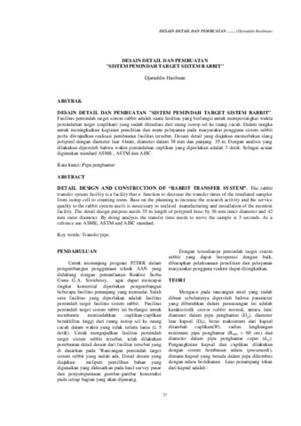 DESAIN DETAIL DAN PEMBUATAN "SISTEM PEMINDAH TARGET SISTEM RABBIT". Fasilitas pemindah target sistem rabbit adalah suatu fasilitas yang berfungsi untuk mempersingkat waktu pemindahan target (cuplikan) yang sudah diiradiasi dari ruang isotop sel ke ruang cacah. Dalam rangka untuk meningkatkan kegiatan penelitian dan mutu pelayanan pada masyarakat pengguna sistem rabbit perlu diwujudkan realisasi pembuatan fasilitas tersebut. Desain detail yang diajukan memerlukan slang polipinil dengan diameter luar 44mm, diameter dalam 38 mm dan panjang 35 m. Dengan analisis yang dilakukan diperoleh bahwa waktu pemindahan cuplikan yang diperlukan adalah 3 detik. Sebagai acuan digunakan standard ASME , ASTM dan AISC.