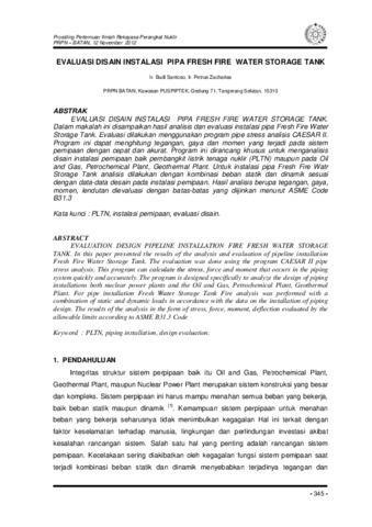 EVALUASI DISAIN INSTALASI PIPA FRESH FIRE WATER STORAGE TANK. Dalam makalah ini disampaikan hasil analisis dan evaluasi instalasi pipa Fresh Fire Water Storage Tank. Evaluasi dilakukan menggunakan program pipe stress analisis CAESAR II. Program ini dapat menghitung tegangan, gaya dan momen yang terjadi pada sistem pemipaan dengan cepat dan akurat. Program ini dirancang khusus untuk menganalisis disain instalasi pemipaan baik pembangkit listrik tenaga nuklir (PLTN) maupun pada Oil and Gas, Petrochemical Plant, Geothermal Plant. Untuk instalasi pipa Fresh Fire Watr Storage Tank analisis dilakukan dengan kombinasi beban statik dan dinamik sesuai dengan data-data desain pada instalasi pemipaan. Hasil analisis berupa tegangan, gaya, momen, lendutan dievaluasi dengan batas-batas yang diijinkan menurut ASME Code B31.3
