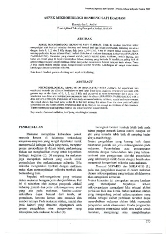 Telah di lakukan penelitian untuk mempelajari efek iradiasi terhadap dendeng sapi berasal dari tiga lokasi pembuatan. Oendeng diiradiasi dengan dosis 0, 1,2, dan 3 kGy dengan laju dosis 1,149 kGy/j. Yang di simpan dalam kemasan plastik tertutup pada suhu kamar selama 6 hari. Iradiasi dilakukan di iradiator Panorama Serba Guna (JRP ASENA PATIR-BATAN). Parameter yang diamati adalah jumlah beketri aerob, koliform, jumlah kapang, dan kadar air. Hasil yang di dapat menunjukan bahwa dendeng yang berkode B kondisinya paling baik di antara ketiga macam sampel dendeng dilihat dari jumlah kontaminasi bakteri maupun kadar aimya. Oosis 3 kGy masih terlalu rendah untuk mengeliminasi seluruh rnikroba. Kandungan air sangat menentukan kandungan dan pertumbuhan mikroba,