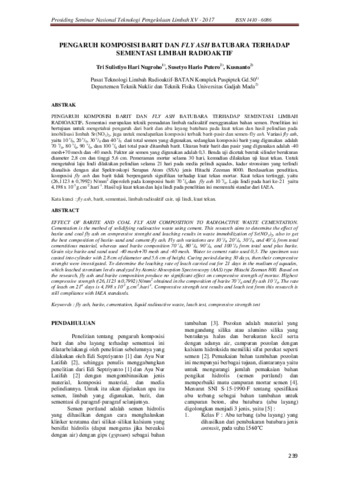 PENGARUH KOMPOSISI BARIT DAN FLY ASH BATUBARA TERHADAP SEMENTASI LIMBAH RADIOAKTIF. Sementasi merupakan teknik pemadatan limbah radioaktif menggunakan bahan semen. Penelitian ini bertujuan untuk mengetahui pengaruh dari barit dan abu layang batubara pada kuat tekan dan hasil pelindian pada imobilisasi limbah Sr(NO3), juga untuk mendapatkan komposisi terbaik barit-pasir dan semen-fly ash. Variasi fly ash,yaitu 10v/0, 20v/0, 30v/02dan 40v/dari total semen yang digunakan, sedangkan komposisi barit yang digunakan adalah70 v/0, 80 v/0, 90 v/0, dan 100 v/00 dari total pasir ditambah barit. Ukuran butir barit dan pasir yang digunakan adalah -40
