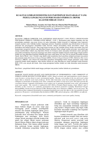 Hanny Aryantie, Melania and Purwati, Sri Unon and Diah Pitalokasari, Oktaria (2017) KUALITAS LIMBAH DOMESTIK DAN PARTISIPASI MASYARAKAT YANG PEDULI LINGKUNGAN DI PERUMAHAN PERMATA DEPOK KLASTER MIRAH 1 DAN 2. Seminar Nasional Teknologi Pengelolaan Limbah XV tahun 2017. ISSN 1410-6086