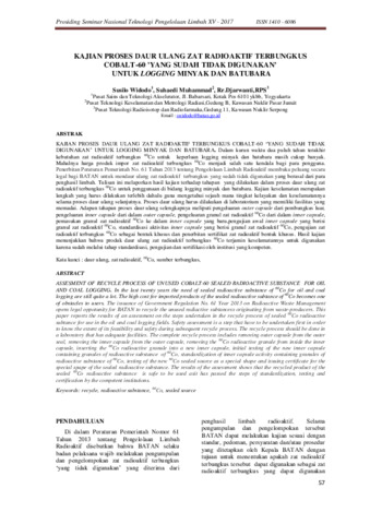 Widodo, Susilo and Muhammad, Suhaedi and RPS, Rr.Djarwanti (2017) KAJIAN PROSES DAUR ULANG ZAT RADIOAKTIF TERBUNGKUS COBALT-60 ’YANG SUDAH TIDAK DIGUNAKAN’ UNTUK LOGGING MINYAK DAN BATUBARA. Seminar Nasional Teknologi Pengelolaan Limbah XV tahun 2017. ISSN 1410-6086