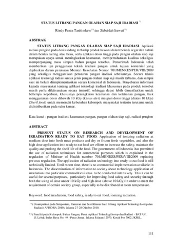 saat ini belum diimplementasikan secara komersial di Indonesia. Penyebaran informasi kepada masyarakat tentang aplikasi teknologi iradiasi khususnya pada produk tersebut masih perlu dilaksanakan secara intensif, sehingga dapat lebih dimanfaatkan untuk beberapa keperluan, khususnya peningkatan keamanan dan ketahanan
