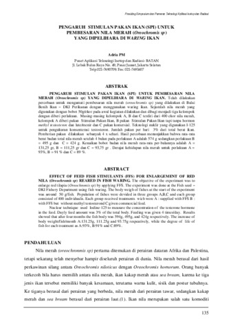 -bulannya adalah A = 131,25 gr, B = 111,25 gr dan C = 93,75 gr . Derajat kehidupan nila merah untuk perlakuan A = 93%, B = 91 % dan C = 89 %