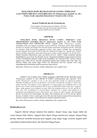 Widiarsih, Sasanti and Dwimahyani, Ita (2010) PENGARUH DOSIS IRADIASI SINAR GAMMA TERHADAP LAJU ERTUMBUHAN ANGGREK BULAN (Phalaenopsis amabilis (L.) Bl.) PADA FASE AKLIMATISASI DAN VEGETATIF AWAL. In: Prosiding Simposium dan Pameran Teknologi Aplikasi Isotop dan Radiasi, 27-28 2010, 27-28 Oktober 2010, Jakarta.