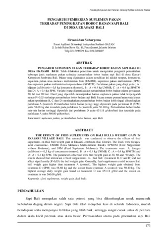 Telah dilakukan penelitian untuk mengetahui pengaruh penambahan beberapa jenis suplemen pakan terhadap pertambahan bobot badan sapi Bali di desa Ekasari