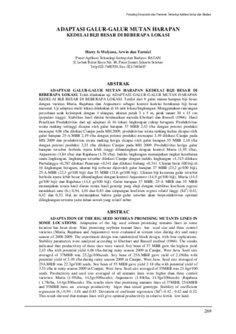 KEDELAI BIJI BESAR DI BEBERAPA LOKASI. Terdiri dari 9 galur mutan harapan biji besar dengan varietas Muria, Rajabasa dan Anjasmoro sebagai kontrol kedelai berukuran biji besar nasional. Uji adaptasi multi lokasi dilakukan di 16 unit lokasi/lingkungan. Menggunakan rancangan percobaan acak kelompok dengan 4 ulangan, ukuran petak 3 x 5 m, jarak tanam 30 x 15 cm (populasi tinggi). Stabilitas hasil dinilai berdasarkan metoda Eberhart dan Russell (1966). Hasil Penelitian Produktivitas dari uji adaptasi di 16 lokasi lingkungan cukup beragam. Produktivitas rerata ranking tertinggi dicapai oleh galur harapan 37 MBB 2,43 t/ha dengan potensi produksi