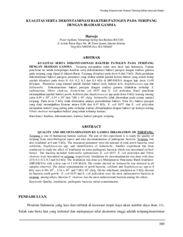 dekontaminasi bakteri patogen, parameter yang diukur adalah jumlah koloni bakteri yang masih hidup setelah diiradiasi pada dosis 0; 0,1; 0,2; 0,3 dan 0,4 kGy di IRPASENA dengan laju dosis 1,149 kGy/jam. Parameter yang diamati adalah Jumlah bakteri arob, bakteri koli, taphylococcus