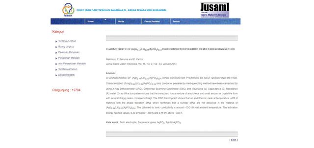 Makhsun, Makhsun and Sakuma, T and Kartini, E (2014) CHARACTERISTIC OF (AgI)0.44(LiI)0.22(AgPO3)0.34 IONIC CONDUCTOR PREPARED BY MELT QUENCHING METHOD. Jurnal Sains Materi Indonesia, 15 (2). p. 84. ISSN 1411-1098