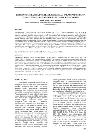 Rixson, Leons and Stefanus, Megy (2017) KONSENTRASI RADIOAKTIVITAS LINGKUNGAN DALAM PARTIKULAT UDARA (PM10) DI KAWASAN NUKLIR PASAR JUMAT (KNPJ). Seminar Nasional Teknologi Pengelolaan Limbah XV tahun 2017. ISSN 1410-6086