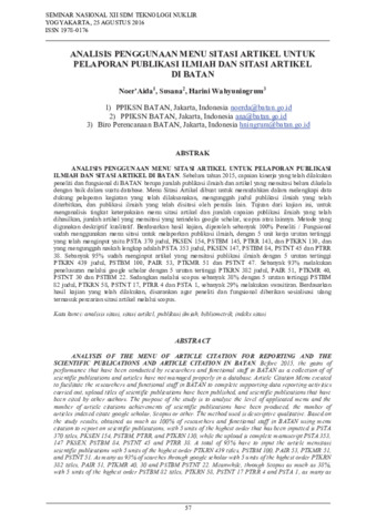 ANALISIS PENGGUNAAN MENU SITASI ARTIKEL UNTUK PELAPORAN PUBLIKASI ILMIAH DAN SITASI ARTIKEL DI BATAN. Sebelum tahun 2015, capaian kinerja yang telah dilakukan peneliti dan fungsional di BATAN berupa jumlah publikasi ilmiah dan artikel yang mensitasi belum dikelola dengan baik dalam suatu database. Menu Sitasi Artikel dibuat untuk memudahkan dalam melengkapi data dukung pelaporan kegiatan yang telah dilaksanakan, mengunggah judul publikasi ilmiah yang telah diterbitkan, dan publikasi ilmiah yang telah disitasi oleh penulis lain. Tujuan dari kajian ini, untuk menganalisis tingkat keterpakaian menu sitasi artikel dan jumlah capaian publikasi ilmiah yang telah dihasilkan, jumlah artikel yang mensitasi yang terindeks google scholar, scopus atau lainnya. Metode yang digunakan deskriptif kualitatif. Berdasarkan hasil kajian, diperoleh sebanyak 100% Peneliti / Fungsional sudah menggunakan menu sitasi untuk melaporkan publikasi ilmiah, dengan 5 unit kerja urutan tertinggi yang telah menginput yaitu PSTA 370 judul, PKSEN 154, PSTBM 145, PTRR 143, dan PTKRN 130, dan yang mengunggah naskah lengkap adalah PSTA 353 judul, PKSEN 147, PSTBM 84, PSTNT 45 dan PTRR 38. Sebanyak 95% sudah menginput artikel yang mensitasi publikasi ilmiah dengan 5 urutan tertinggi PTKRN 439 judul, PSTBM 100, PAIR 53, PTKMR 51 dan PSTNT 47. Sebanyak 93% melakukan penelusuran melalui google scholar dengan 5 urutan tertinggi PTKRN 382 judul, PAIR 51, PTKMR 40, PSTNT 30 dan PSTBM 22. Sedangkan melalui scopus sebanyak 38% dengan 5 urutan tertinggi PSTBM 82 judul, PTKRN 58, PSTNT 17, PTRR 4 dan PSTA 1, sebanyak 29% melakukan swasitiran. Berdasarkan hasil kajian yang telah dilakukan, disarankan agar peneliti dan fungsional diberikan sosialisasi ulang termasuk pencarian sitasi artikel melalui scopus.