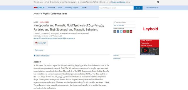 In this paper, the authors report the fabrication of Zn0.2Fe2.8O4 particles from Indonesian sand in the forms of nanopowder and magnetic fluid. The fabrication was conducted by employing a combined coprecipitation-sonochemical method. The analysis of the XRD data presented that the Zn0.2Fe2.8O4 was crystallized in a spinel structure with a lattice parameter of about 8.378 Å. The data analysis of the TEM image showed the Zn0.2Fe2.8O4 particles distributed in nanometric size with a spherical shape. The magnetic investigation showed that the magnetic nanopowder and fluid both had superparamagnetic character. Moreover, the band gap of the Zn0.2Fe2.8O4 particles was about 2.28 eV. These characters open a significant opportunity for the prepared samples to be applied for sensory and antibacterial applications.