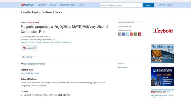 Purwanto, S. and Salim, M and Yunasfi, Yunasfi (2018) Magnetic properties α-Fe2O3Filled MWNT/PolyVinyl Alcohol Composites Film. Journal of Physics: Conference Series, 1091. 012022. ISSN 1742-6588