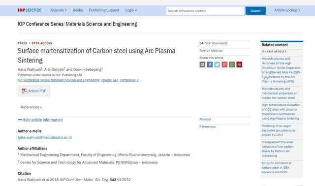 Wahyudi, Haris and Dimyati, Arbi and Sebayang, Darwin (2018) Surface martensitization of Carbon steel using Arc Plasma Sintering. IOP Conference Series: Materials Science and Engineering, 343. 012032. ISSN 1757-8981