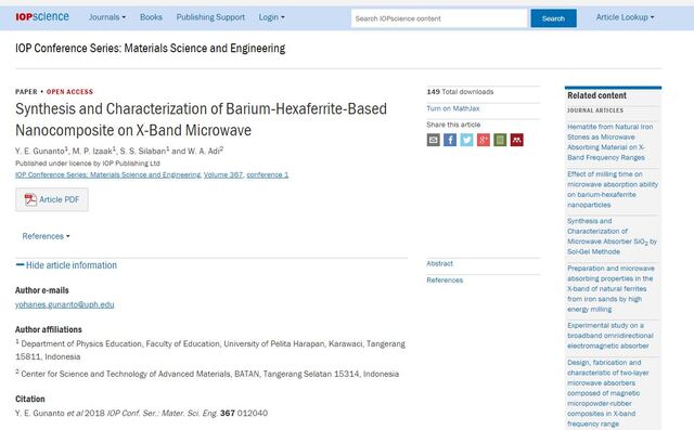 Gunanto, Y. E. and Izaak, M. P. and Silaban, S. S. and Adi, W. A. (2018) Synthesis and Characterization of Barium-Hexaferrite-Based Nanocomposite on X-Band Microwave. IOP Conference Series: Materials Science and Engineering, 367. 012040. ISSN 1757-8981