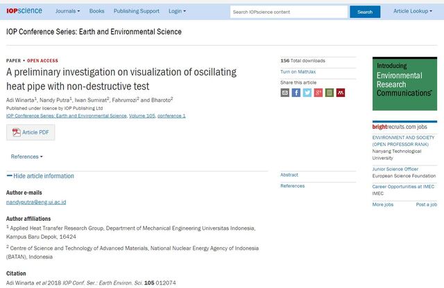 Winarta, Adi and Putra, Nandy and Sumirat, Iwan and Fahrurrozi, Fahrurrozi and Bharoto, Bharoto (2018) A preliminary investigation on visualization of oscillating heat pipe with non-destructive test. IOP Conference Series: Earth and Environmental Science, 105. 012074. ISSN 1755-1307