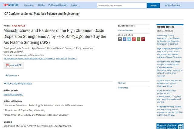 Bandriyana, Bandriyana and Dimyati, Arbi and Sujatno, Agus and Salam, Rohmad and Sumaryo, Sumaryo and Untoro, Pudji and Suharno, Bambang (2018) Microstructures and Hardness of the High Chromium Oxide Dispersion Strengthened Alloy Fe-25Cr-Y2O3Sintered by the Arc Plasma Sintering (APS). IOP Conference Series: Materials Science and Engineering, 333. 012045. ISSN 1757-8981