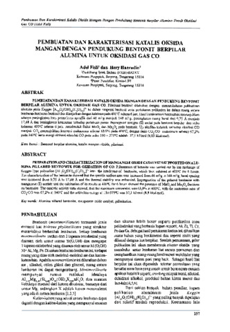 PEMBUATAN DAN KARAKTERISASI KATALIS OKSIDA MANGAN DENGAN PENDUKUNG BENTONIT BERPILAR ALUMINA UNTUK OKSIDASI GAS CO. Pilarisasi bentonit dilakukan dengan menambahkan polikatioan alumina jenis Keggin [AlI3O4 (OH) 24 (H20) 12]'+ ke dalam suspensi bentonit serta pertukaran polikation ke dalam ruang antara lembaran-lembaran benton it clan dilanjutkan dengan kalsiriasi pada 400 C selama 6 jam. Hasil karakterisasi bentonitini menunjukkan adanya peningkatan luas permukaan spesifik daTi 46 m'/g menjadi 148 m'/g, peningkatan ruang basal daTi 9, 75 A menjadi 17, 48 A clan peningkatan ketahanan terhadap perlakuan panas. Impregnasi mangan (ll) asetat pada benton it berpilar clan suhu kalsinasi 400 C selama 6 jam, membentuk fraksi MnO, clan Mn, O3 pada bentonit. Uji aktifitas katalitik terhadap oksidasi CO menjadi CO2 menunjukkan konversi maksimum sebesar 63, 9% pada 400 C, dengan rasio CO,/CO maksimum sebesar 67, 2% pada 340 C serta energi aktivasi adsorbsi CO pada suhu 150-375 C adalah 37, 1 kllmol (8, 83 kkal/mol).