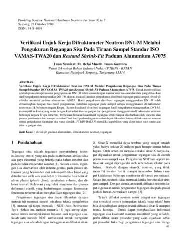 Verifikasi Unjuk Kerja Difraktometer Neutron DN1-M Melalui Pengukuran Regangan Sisa Pada Tiruan Sampel Standar ISO VAMAS-TWA20 dan Restand Shrink-Fit Paduan Alumunium A7075. Untuk memverifikasi apakah prosedur operasional pengoperasian DN1-M telah sesuai dengan standar internasional dan data yang dihasilkan dari pengukuran menggunakan DN1-M akurat, maka dilakukan pengukuran distribusi regangan pada sampel shrink-fit silinder uniaksial paduan alumunium A7075. Hasil pengukuran distribusi regangan menggunakan DN1-M telah dibandingkan dengan hasil-hasil pengukuran distribusi regangan pada sampel serupa menggunakan difraktometer neutron milik beberapa negara Eropa. Secara kualitatif distribusi regangan hasil pengukuran menggunakan DN1-M. menunjukkan kurva yang sama dengan kurva distribusi regangan dari pengukuran menggunakan difraktometer neutron beberapa negara Eropa tersebut. Perbedaan besaran kuantitatif regangan lebih banyak disebabkan oleh dimensi dan proses pembuatan dari sampel tersebut Dari hasil perbandingan tersebut dapat diketahui bahwa difraktometer neutron untuk pengukuran tegangan sisa yang dimiliki PTBIN-BATAN memiliki kapabilitas yang diperlukan oleh suatu alat ukur tegangan sisa