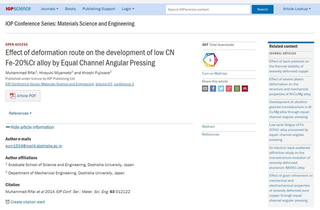 Rifai, Muhammad and Miyamoto, Hiroyuki and Fujiwara, Hiroshi (2014) Effect of deformation route on the development of low CN Fe-20%Cr alloy by Equal Channel Angular Pressing. IOP Conference Series: Materials Science and Engineering, 63. 012122. ISSN 1757-8981
