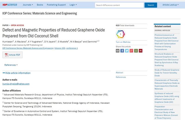 Kurniasari, Kurniasari and Maulana, A and Nugraheni, A Y and Jayanti, D N and Mustofa, S and Baqiya, M A and Darminto, Darminto (2017) Defect and Magnetic Properties of Reduced Graphene Oxide Prepared from Old Coconut Shell. IOP Conference Series: Materials Science and Engineering, 196. 012021. ISSN 1757-8981