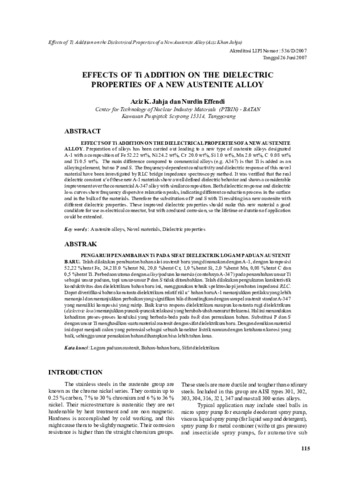 Jahja, A.K and Effendi, Nurdin (2007) EFFECTS OF Ti ADDITION ON THE DIELECTRIC PROPERTIES OF A NEW AUSTENITE ALLOY. Jurnal Sains Materi Indonesia, 9 (2). pp. 115-120. ISSN 1411-1098