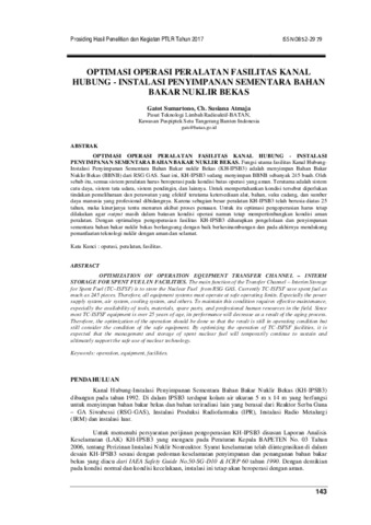 Sumartono, Gatot and Atmaja, Ch. Susiana (2018) OPTIMASI OPERASI PERALATAN FASILITAS KANAL HUBUNG - INSTALASI PENYIMPANAN SEMENTARA BAHAN BAKAR NUKLIR BEKAS. Prosiding Hasil Penelitian dan Kegiatan PTLR Tahun 2017. ISSN 0852-2979