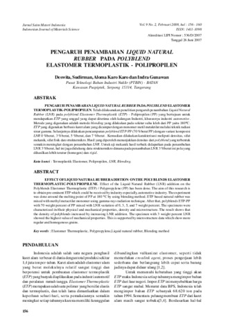 Deswita, Deswita and Sudirman, Sudirman and Karo Karo, Aloma and Gunawan, Indra (2007) PENGARUH PENAMBAHAN LIQUID NATURAL RUBBER PADA POLYBLEND ELASTOMER TERMOPLASTIK - POLIPROPILEN. Jurnal Sains Materi Indonesia, 9 (2). pp. 156-160. ISSN 1411-1098