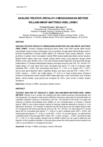 ANALISIS TEKSTUR ZIRCALOY-4 MENGGUNAKAN METODE WILLIAM–IMHOF–MATTHIES-VINEL (WIMV).pdf - Published Version