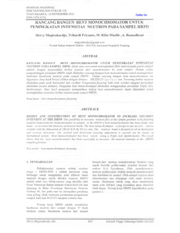 Mugirahardjo, Herry and Priyanto, Tri Hardi and Ramadhani, A and Muslih, M. Refai (2011) RANCANG BANGUN BENT MONOCHROMATOR UNTUK PENINGKATAN INTENSITAS NEUTRON PADA SAMPEL HRPD. In: SEMINAR NASIONAL SDM TEKNOLOGI NUKLIR VII, 16 NOVEMBER 2011, YOGYAKARTA.