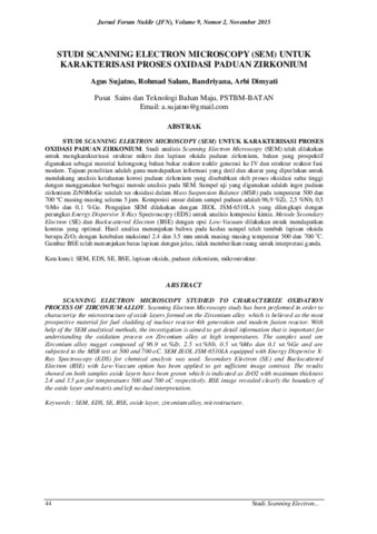 Sujatno, Agus and Salam, Rohmad and Bandriyana, Bandriyana and Dimyati, Arbi (2015) STUDI SCANNING ELECTRON MICROSCOPY (SEM) UNTUK KARAKTERISASI PROSES OXIDASI PADUAN ZIRKONIUM. urnal Forum Nuklir (JFN), 9 (1). pp. 44-50.