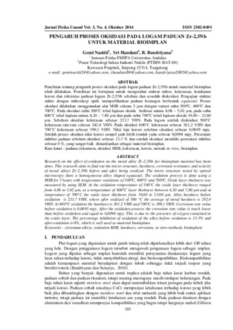 Nastiti, Gemini and Handani, Sri and Bandriyana, Bandriyana (2014) PENGARUH PROSES OKSIDASI PADA LOGAM PADUAN Zr-2,5Nb UNTUK MATERIAL BIOIMPLAN. Jurnal Fisika Unand, 3 (4). pp. 205-213. ISSN 2302-8491