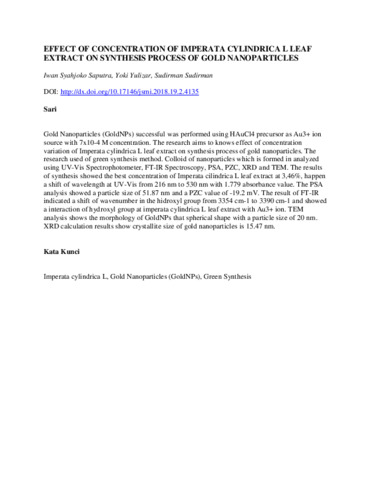 EFFECT OF CONCENTRATION OF IMPERATA CYLINDRICA L LEAF EXTRACT ON SYNTHESIS PROCESS OF GOLD NANOPARTICLES.pdf - Published Version