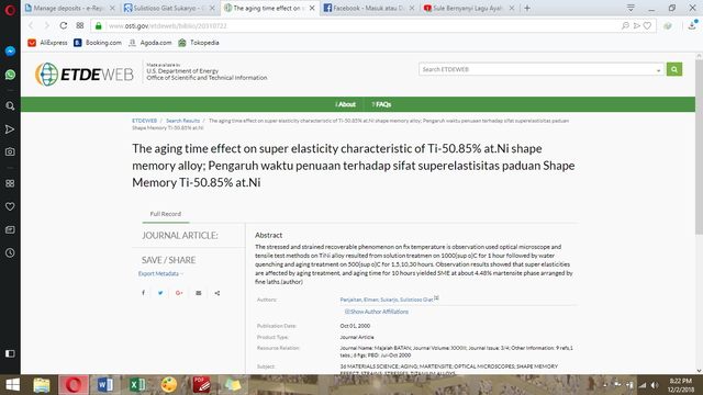 Sukaryo, Sulistioso Giat and Elman, P (2000) The aging time effect on super elasticity characteristic of Ti-50.85% at.Ni shape memory alloy; Pengaruh waktu penuaan terhadap sifat superelastisitas paduan Shape Memory Ti-50.85% at.Ni. Majalah BATAN, 33. pp. 75-84.
