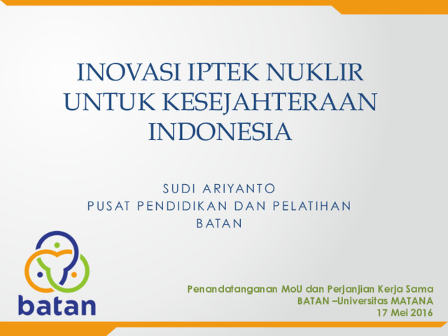 Ariyanto, Sudi (2016) INOVASI IPTEK NUKLIR UNTUK KESEJAHTERAAN INDONESIA. In: INOVASI IPTEK NUKLIR UNTUK KESEJAHTERAAN INDONESIA, 17 May 2016. (In Press)