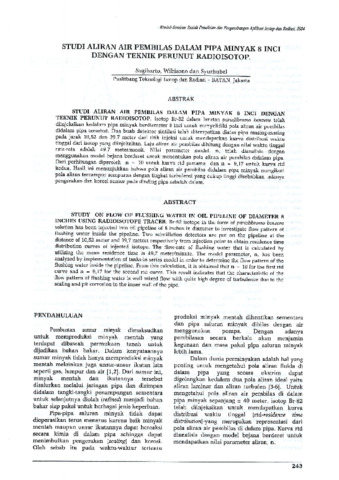 Isotop Br-S2 dalam larutan paradibromo benzene telah diinjeksikan kedalam pipa minyak berdiameter 8 inci untuk menyelidiki pola aliran air pembilas didalam pipa terse but. Dua buah detektor sintilasi telah ditempatkan diatas pipa masing-rnasing pada jarak 10,52 dan 39,7 meter dari titik injeksi untuk mendapatkan kurva distribusi waktu tinggal dari isotop yang diinjeksikan. Laju aliran air pembilas dihitung dengan nilai waktu tinggal rata-rata adalah 49,7 meter/menit. Nilai parameter model, n, telah dianalisis dengan menggunakan model bejana berderet untuk menentukan pol a aliran air pembilas didalam pipa. Dari perhitungan diperoleh n - 10 untuk kurva rtd pertama dan n - 9,17 untuk kurva rtd kedua. Hasil ini menunjukkan bahwa pola aliran air pembilas didalam pipa minyak mengikuti pola aliran tercampur sempurna dengan tingkat turbulensi yang cukup tinggi disebabkan adanya pengerakan dan korosi surnur pada dinding pipa sebelah dalam.