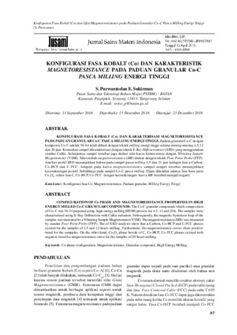 Purwanto, Setyo and Sukirman, Engkir (2017) CONFIGURATION OF Co PHASE AND MAGNETORESISTANCE PROPERTIES IN HIGH ENERGYMILLED Co-CGRANULAR COMPOUNDS. Jurnal Sains Materi Indonesia, 18 (02). pp. 87-91. ISSN 1411-1098