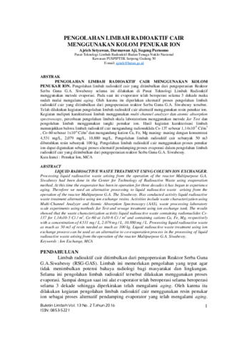 Setyawan, Ajreh and Aji, Darmawan and Purnomo, Sugeng (2016) PENGOLAHAN LIMBAH RADIOAKTIF CAIR MENGGUNAKAN KOLOM PENUKAR ION. Buletin Limbah Vol. 13 No. 2 Tahun 2016. ISSN 0853-5221