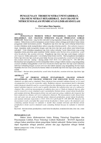 Ibnu Saputra, Dwi Luhur (2016) PENGGUNAAN THORIUM NITRAT PENTAHIDRAT, URANIUM NITRAT HEXAHIDRAT, DAN URANIUM NITRICIUM DALAM PEMBUATAN LIMBAH SIMULASI. Buletin Limbah Vol. 13 No. 2 Tahun 2016. ISSN 0853-5221