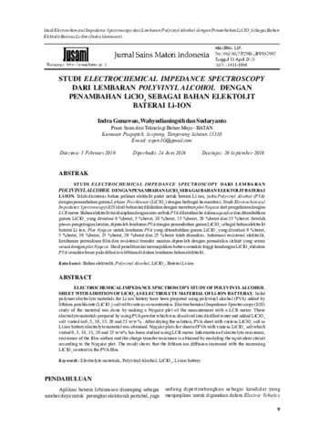 Telah disintesis bahan polimer elektolit padat untuk baterai Li ion, yaitu Polyvinyl Alcohol (PVA) dengan penambahan garam Lithium Perchlorate (LiClO4) dengan berbagai konsentrasi. Studi Electrochemical Impedance Spectroscopy (EIS) dari bahan ini dilakukan dengan membuat plot Nyquist dari pengukuran dengan LCR meter. Bahan elektrolit ini disiapkan dengan cara serbuk PVA dilarutkan ke dalam aquadest dan ditambahkan garam LiClO4 yang divariasi 0 % berat, 5 % berat, 10 % berat, 15 % berat, 20 % berat dan 25 % berat. Setelah proses pengeringan larutan, diperoleh lembaran PVA dengan penambahan garam LiClO4 sebagai bahan elektrolit baterai Li ion. Plot Nyquist untuk lembaran PVA yang ditambahkan garam LiClO4 yang divariasi 0 % berat, 5 % berat, 10 % berat, 15 % berat, 20 % berat dan 25 % berat telah dianalisis. Informasi resistensi elektrolit, ketahanan permukaan film dan resistensi transfer muatan diperoleh dengan pemodelan sirkuit yang setara sesuai dengan plot Nyquist. Hasil penelitian ini menunjukkan bahwa semakin tinggi kandungan LiClO4 didalam PVA semakin besar pula difusi ion lithium di dalam lembaran bahan elektrolit.