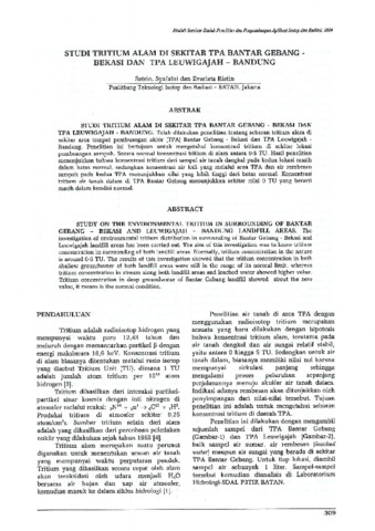 Telah dilakukan penelitian tentang sebaran tritium alam di seki~ar area tempat pembuangan akhir (TPA) Bantar Gebang . Bekasi dan TPA Leuwigajah . Bandung. Penelitian ini bertujuan untuk mengetahui konsentrasi tritium di sekitar lokasi pembuangan sampah. Secara normal konsentrasi tritium di alam antara 0-5 TU. Hasil penelitian menunjukkan bahwa konsentrasi tritium dari sampel air tanah dangkal pada kedua lokasi masih dalain batas normal, sedangkan konsentrasi air kali yang melalui area TPA dan air rembesan sampah pada kedua TP A menunjukkan nilai yang lebih tinggi dari batas normal. Konsentrasi tritium air tanah dalam di TP A Bantar Gebang menunjukkan sekitar nilai 0 TU yang berarti masih dalam kondisi normal.