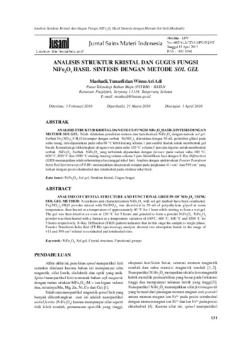 Mashadi, Mashadi and Yunasfi, Yunasfi and Ari Adi, Wisnu (2016) ANALYSIS OF CRYSTAL STRUCTURE AND FUNCTIONAL GROUPS OF NiFe2O4 USING SOL GEL METHOD. Jurnal Sains Materi Indonesia, 17 (03). pp. 131-135. ISSN 1411-1098