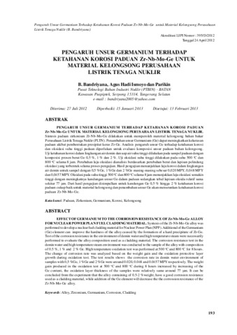 PENGARUH UNSUR GERMANIUM TERHADAP KETAHANAN KOROSI PADUAN ZR-NB-MO-GE UNTUK MATERIAL KELONGSONG PERUSAHAAN LISTRIK TENAGA NUKLIR.pdf - Published Version